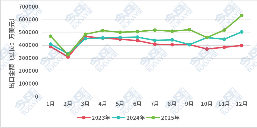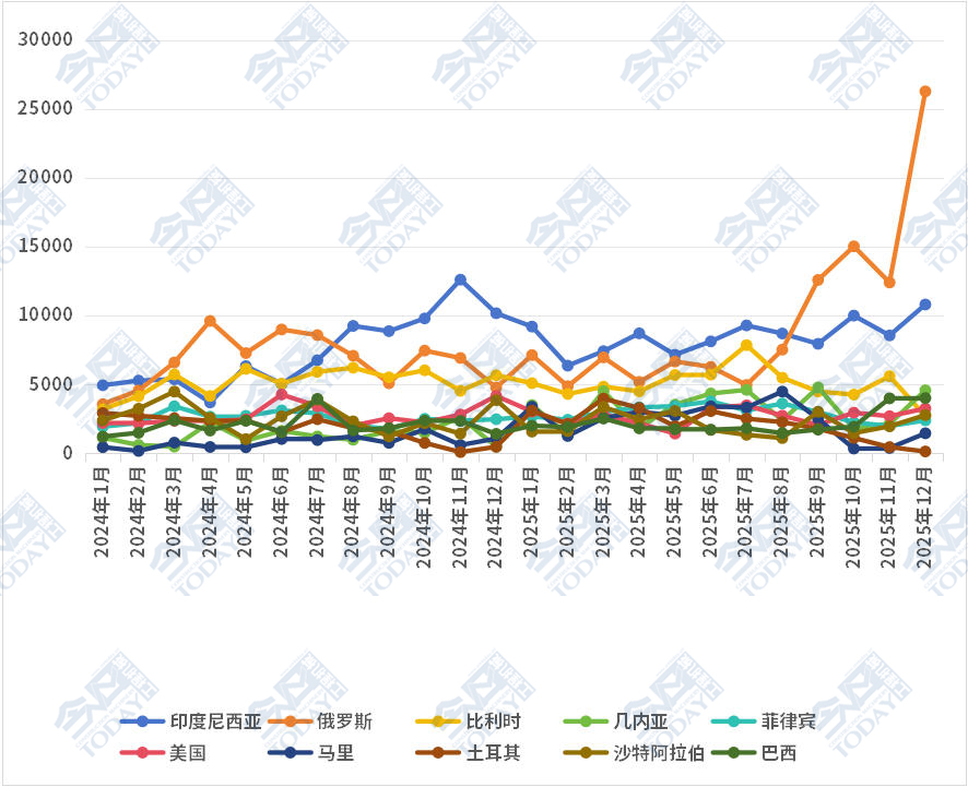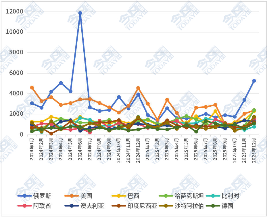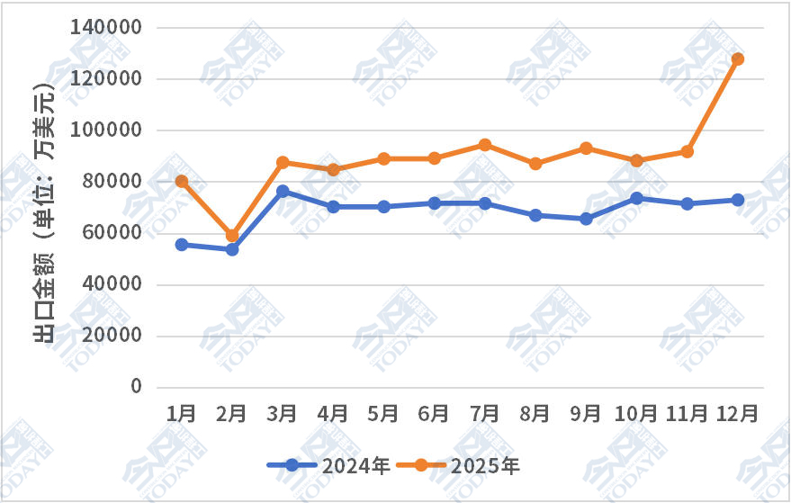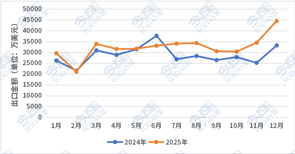 从累计出口额前十的国家来看,马里虽然在2025年全年整体出口额中仅排在第七,但是其在12月表现十分亮眼,环比大幅增长269%,摆脱了此前数月的温和态势。同时巴西同比表现也十分突出,与上年同期相比增长182.85%。