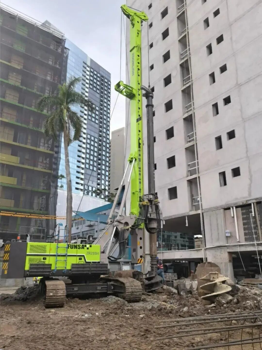 ZR255H旋挖钻机首次投入巴拿马城房建桩基础施工,就展现出强劲的施工能力,高效完成直径1.2米、深度25米的桩孔作业。项目地质以黏土为主,底部为强度约50兆帕的泥岩层,ZR255H凭借“软硬兼施”的适应性,通过高效液压系统兼顾施工速度与油耗控制,配合多档位动力头设计,轻松攻克强风化岩层,仅用3小时就完成单孔钻进,效率令当地团队惊叹不已。项目方负责人不仅认可中联重科产品,也高度肯定了公司的全程服务保障体系。