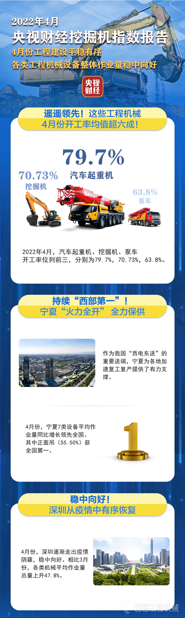 央视财经挖掘机指数显示,4月,宁夏7项指标平均工作量同比增幅领先全国。其中正面吊(55.50%)全国第一、履带起重机(52.60%)全国第二、摊铺机(29%)全国第三、挖掘机(13.20%)全国第二、汽车起重机(12.60%)全国第二、压路机(10.80%)全国第四、搅拌站(4.00%)全国第一。