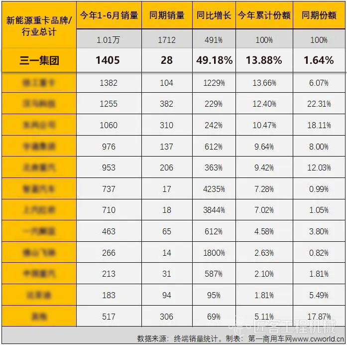 最新数据显示,今年1-6月,三一新能源重卡累计销量1405台,同比增长约4918%,累计市场份额达到13.88%,成为上半年新能源重卡销量及6月销量“双冠王”。