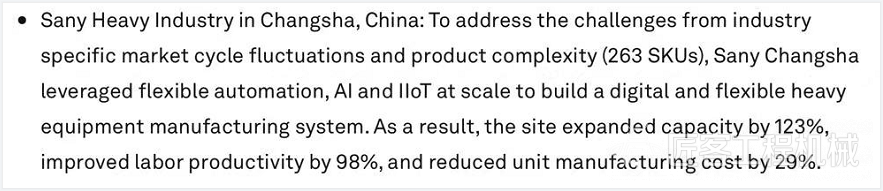 世界经济论坛官网上这样介绍三一18号工厂的入选理由:“为应对重工行业市场的周期性波动、多品种小批量及重型部件生产挑战,三一充分利用柔性自动化生产、人工智能和规模化的IIoT,建立数字化柔性的重型设备制造系统。最终实现工厂产能扩大123%,生产率提高98%,单位制造成本降低29%”。