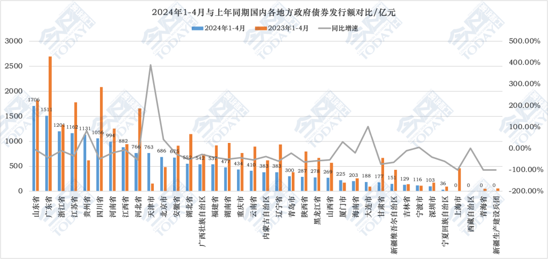 2024年1-4月与上年同期国内各省份地区政府债券发行额度对比