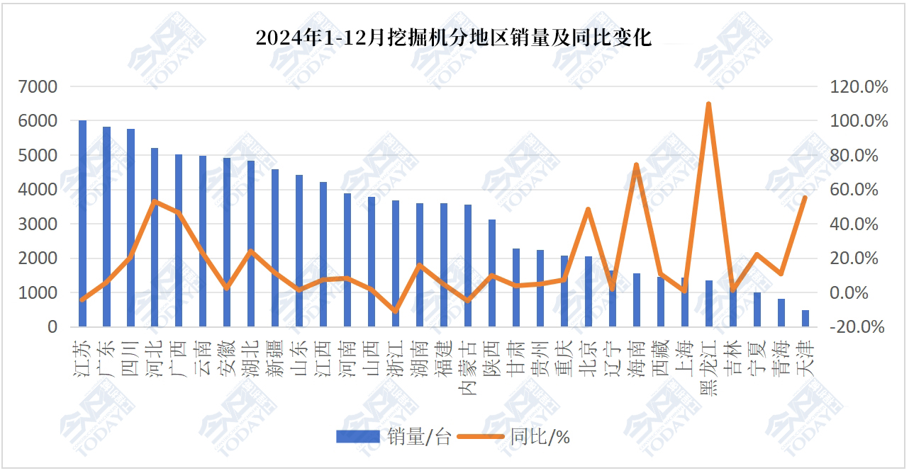 图6 2024年1-12月挖掘机分地区销量及同比变化(数据来源:中国工程机械工业协会)