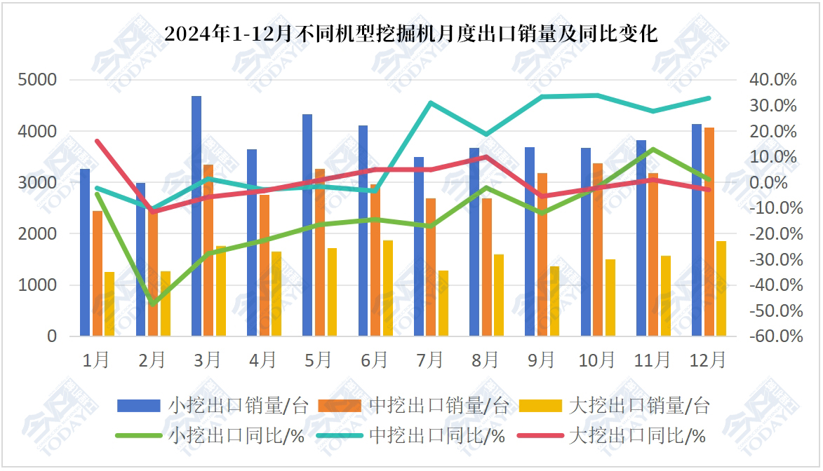 图4 2024年1-12月不同机型挖掘机月度出口销量及同比变化(数据来源:中国工程机械工业协会)