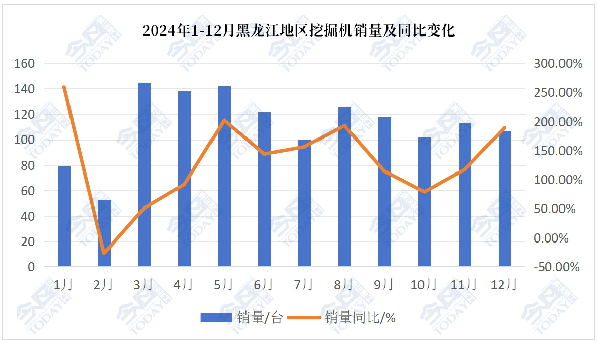 图7 2024年1-12月黑龙江地区挖掘机销量及同比变化(数据来源:中国工程机械工业协会)