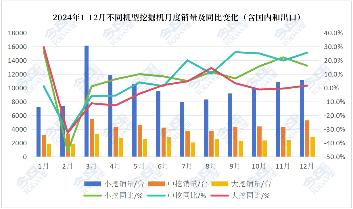 图1 2024年1-12月不同机型挖掘机月度销量及同比变化(含国内和出口)(数据来源:中国工程机械工业协会)
