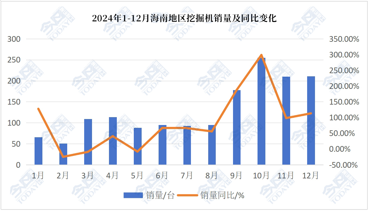 图8 2024年1-12月海南地区挖掘机销量及同比变化(数据来源:中国工程机械工业协会)