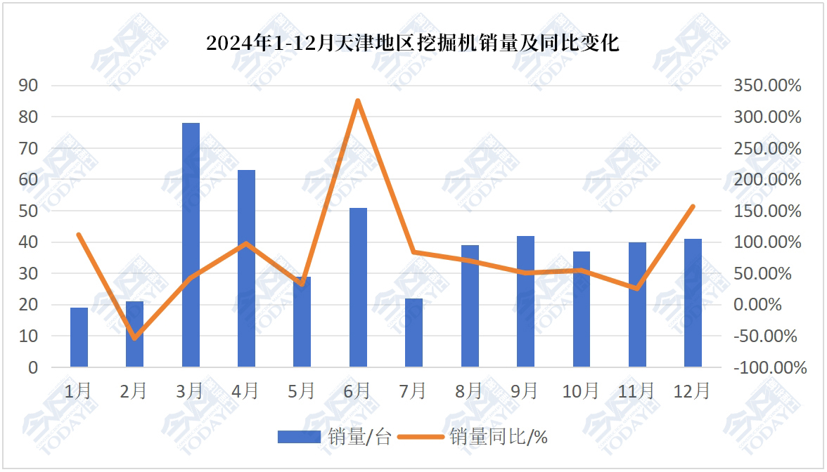 图9 2024年1-12月天津地区挖掘机销量及同比变化(数据来源:中国工程机械工业协会)