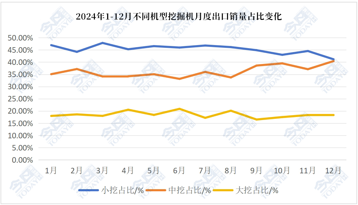 图5 2024年1-12月不同机型挖掘机月度出口销量占比变化 (数据来源:中国工程机械工业协会)