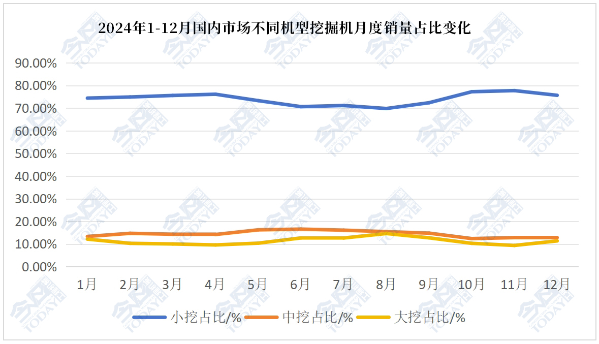 图2 2024年1-12月国内市场不同机型挖掘机月度销量占比变化(数据来源:中国工程机械工业协会)