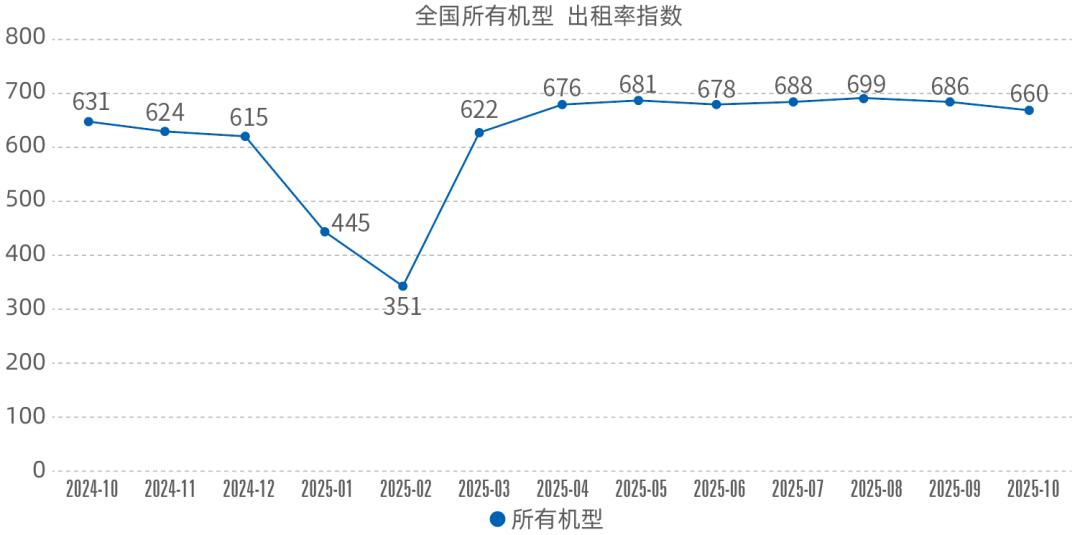2025年10月升降工作平台出租率指数为660点,环比略降3.8%,同比上涨4.6%。总体看10月份各机型环比出租率指数有涨有跌,其中20~24m机型出租率指数环比跌幅最大,达到8.7%,14~16m以上机型环比涨幅最大,达到3.1%。2025年10月绝大多数机型出租率指数同比处于普涨态势,36m以上机型的涨幅都超过了两位数,40m以上机型涨幅最大,达到11.8%,所有机型当中仅20~24m机型出租率指数同比处于下降状态,降幅为2.9%。(出租率是以台天数为基准进行计算,100%出租率对应1000点。)