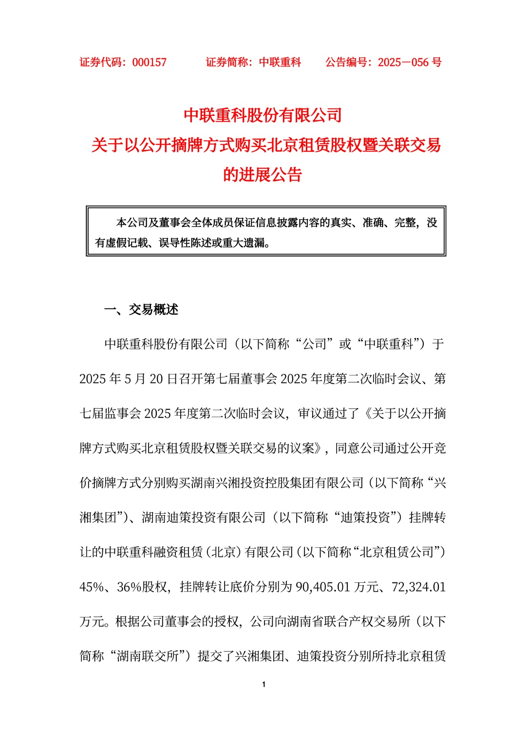 中联重科股份有限公司(以下简称“公司”或“中联重科”)于2025 年 5 月 20 日召开第七届董事会 2025 年度第二次临时会议、第七届监事会 2025 年度第二次临时会议,审议通过了《关于以公开摘牌方式购买北京租赁股权暨关联交易的议案》,同意公司通过公开竞价摘牌方式分别购买湖南兴湘投资控股集团有限公司(以下简称“兴湘集团”)、湖南迪策投资有限公司(以下简称“迪策投资”)挂牌转让的中联重科融资租赁(北京)有限公司(以下简称“北京租赁公司”)45%、36%股权,挂牌转让底价分别为 90405.01 万元、72324.01万元。根据公司董事会的授权,公司向湖南省联合产权交易所(以下简称“湖南联交所”)提交了兴湘集团、迪策投资分别所持北京租赁公司 45%、36%股权的摘牌申请。2025 年 5 月 28 日,公司与兴湘集团签署《产权交易合同》,股权转让价款为 90405.01 万元。2025年 6 月 4 日,公司与迪策投资签署《产权交易合同》,股权转让价款为 72324.01 万元。