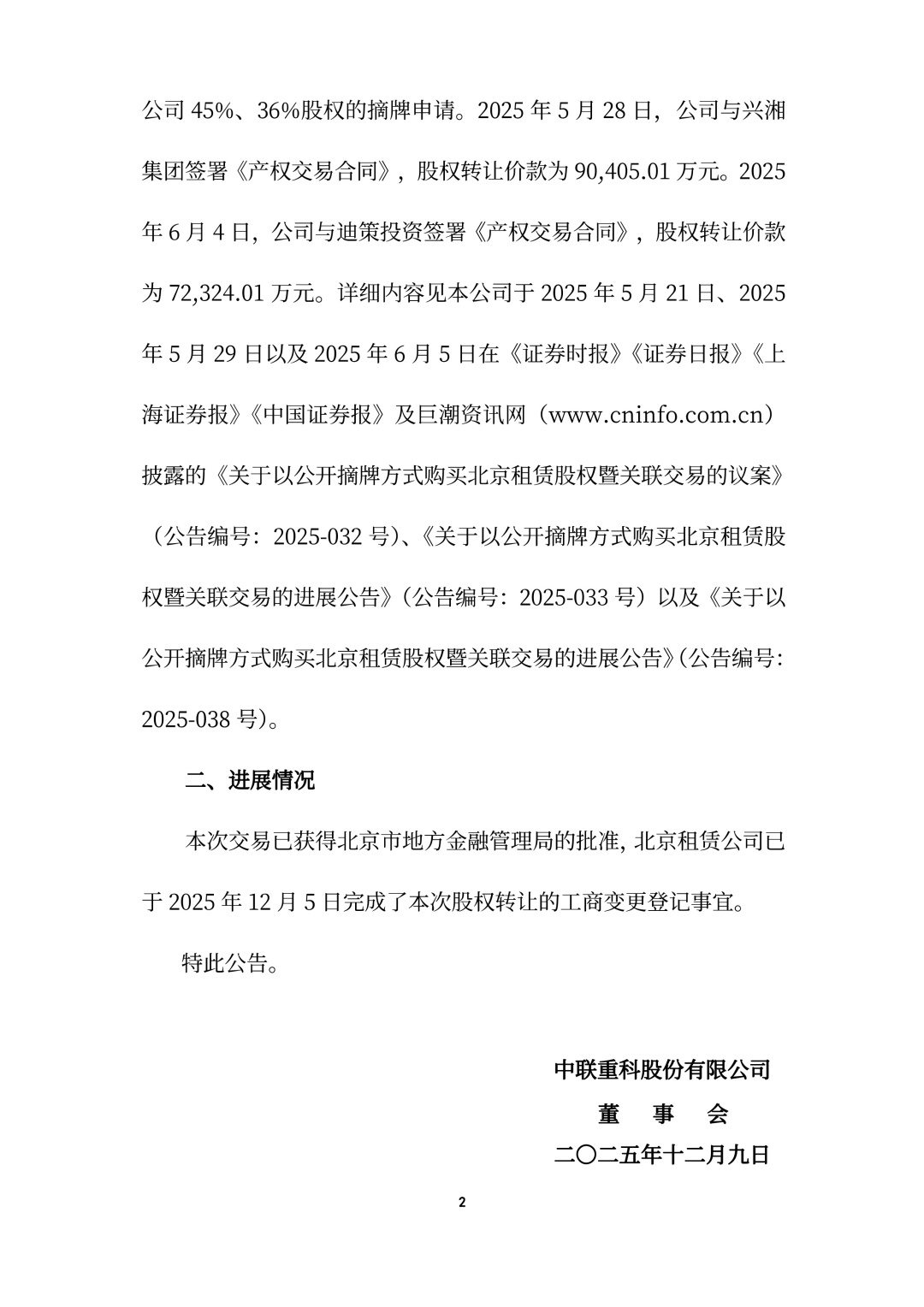 12月9日,中联重科发布《关于以公开摘牌方式购买北京租赁股权暨关联交易的进展公告》。