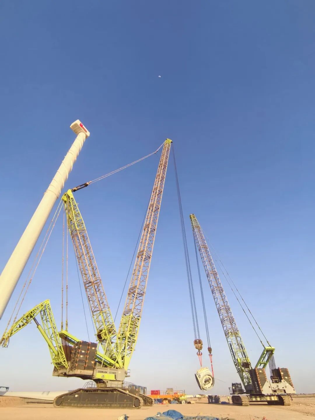 与ZCC18000协同作业的ZCC3200V履带起重机,同样具备硬核实力。这款设备凭借卓越的机动性和高效性,全程负责塔筒分段吊装、部件精准对接等关键工序。两台设备形成黄金吊装组合,高效配合、无缝衔接,将原本需要数周的安装周期大幅缩短,一举创造中东地区大型风机安装速度新纪录,表现出强大的技术优势。