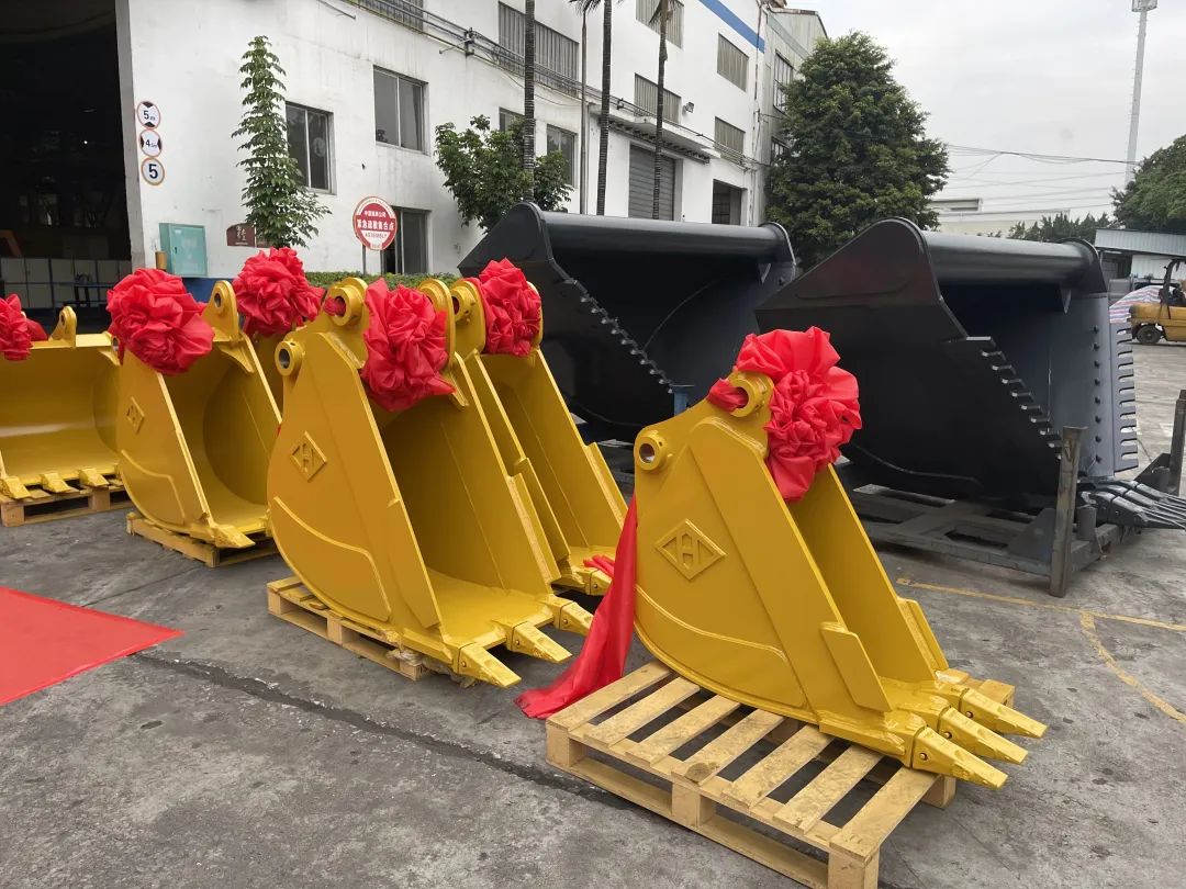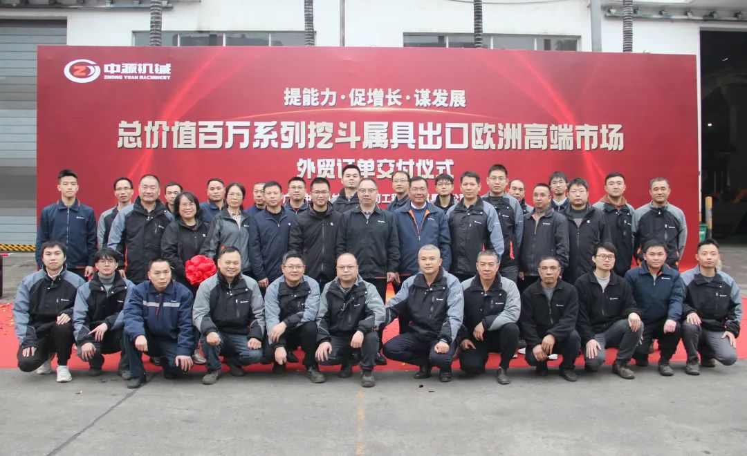 本次交付的属具由中源属具分公司自主研发制造,总价值百万,包含挖斗、倾斜斗、V型斗、筛分斗等,将发往欧洲高端市场,这是中源属具分公司产品首次通过自有渠道出口欧洲。