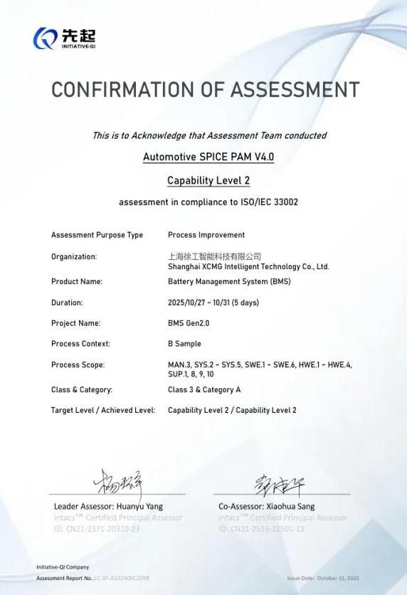 近日,徐工研究总院BMS团队成功通过Automotive SPICE PAM 4.0 Capability Level 2(以下简称“ASPICE 4.0 CL2”)评估审核。徐工成为国内工程机械首家通过该认证的企业,意味着徐工自研BMS控制器开发流程能力达到业内国际领先水平。