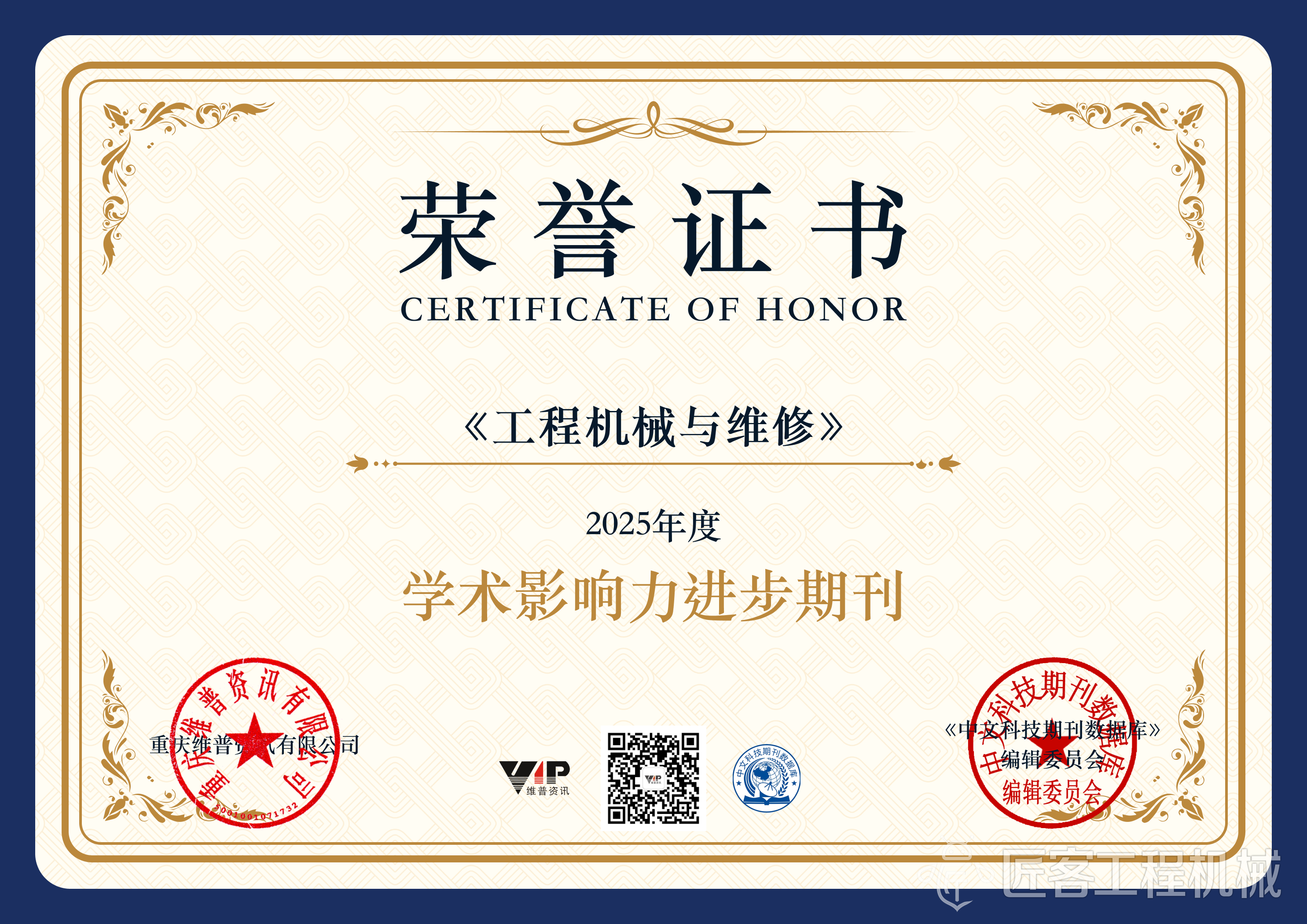近日,由重庆维普资讯有限公司主办的2025年度学术期刊评选结果正式揭晓。经过严格的数据统计与专家评审,由北京卓众出版有限公司主办,中国机械工业联合会主管的《工程机械与维修》(CN 11-3566/TH, ISSN 1006-2114)凭借在过去一年中学术质量与影响力的显著跃升,在众多优秀期刊中脱颖而出,荣膺 “2025年度学术影响力进步期刊” 称号。